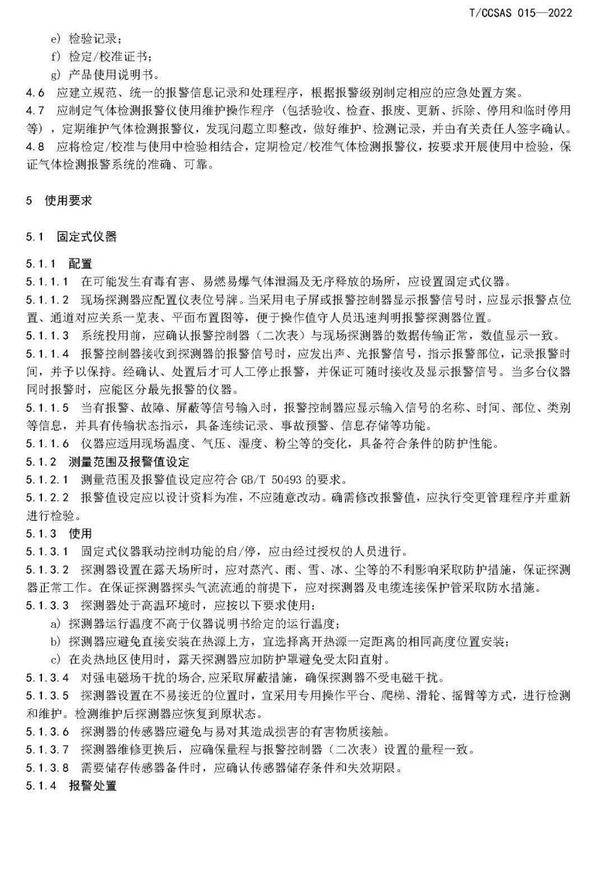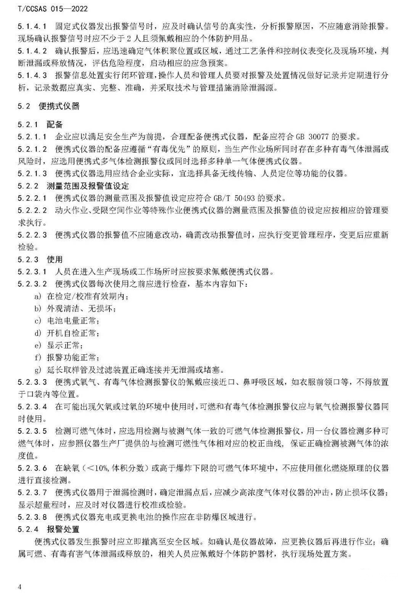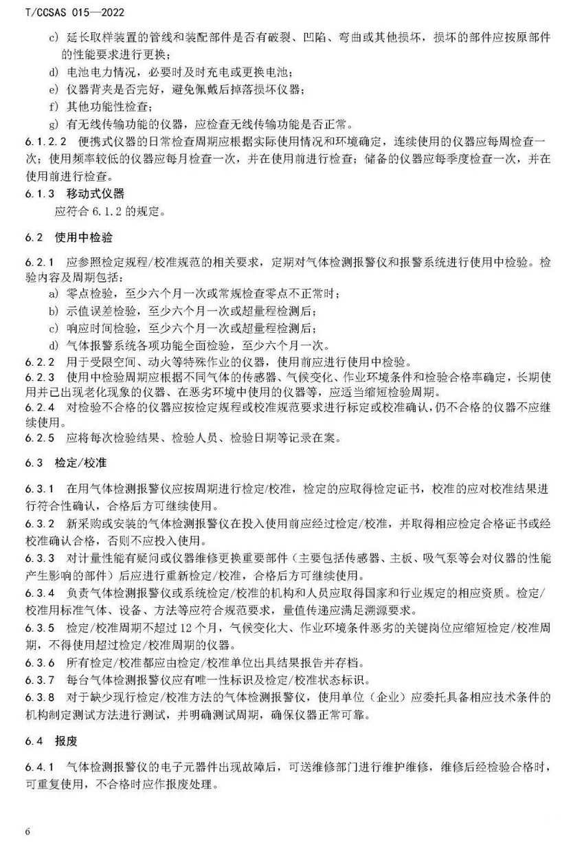 气体检测报警仪作为易燃易爆、有毒有害等危险气体泄漏及无序释放检测报警系统的重要组成部分,正确使用、维护并保证其检测结果的准确性,是预防火灾爆炸、中毒窒息事故的前提条件。《气体检测报警仪安全使用及维护规程》规定了固定式、便携式及移动式三种气体检测报警仪的选择、配置、报警值设定、报警处置、检定/校准、使用中检验、报废处置、资料管理、人员培训等方面的管理要求,为企业精准使用和有效维护各类气体检测报警仪提供了完整、系统的管理方案。如明确了固定式仪器的常规检查项目、便携式仪器使用前检查内容,使得仪器的日常使用和维护有章可循;提出“使用中检验”的理念,强调除了需要定期检定、校准仪器外,还应在使用过程中实时检验,保证气体检测报警仪和报警系统的准确可靠;在报警处置方面要求实施闭环管理,要完整、准确地记录报警及处置情况,并定期进行报警情况统计分析,把握及灵活运用规律性变化。